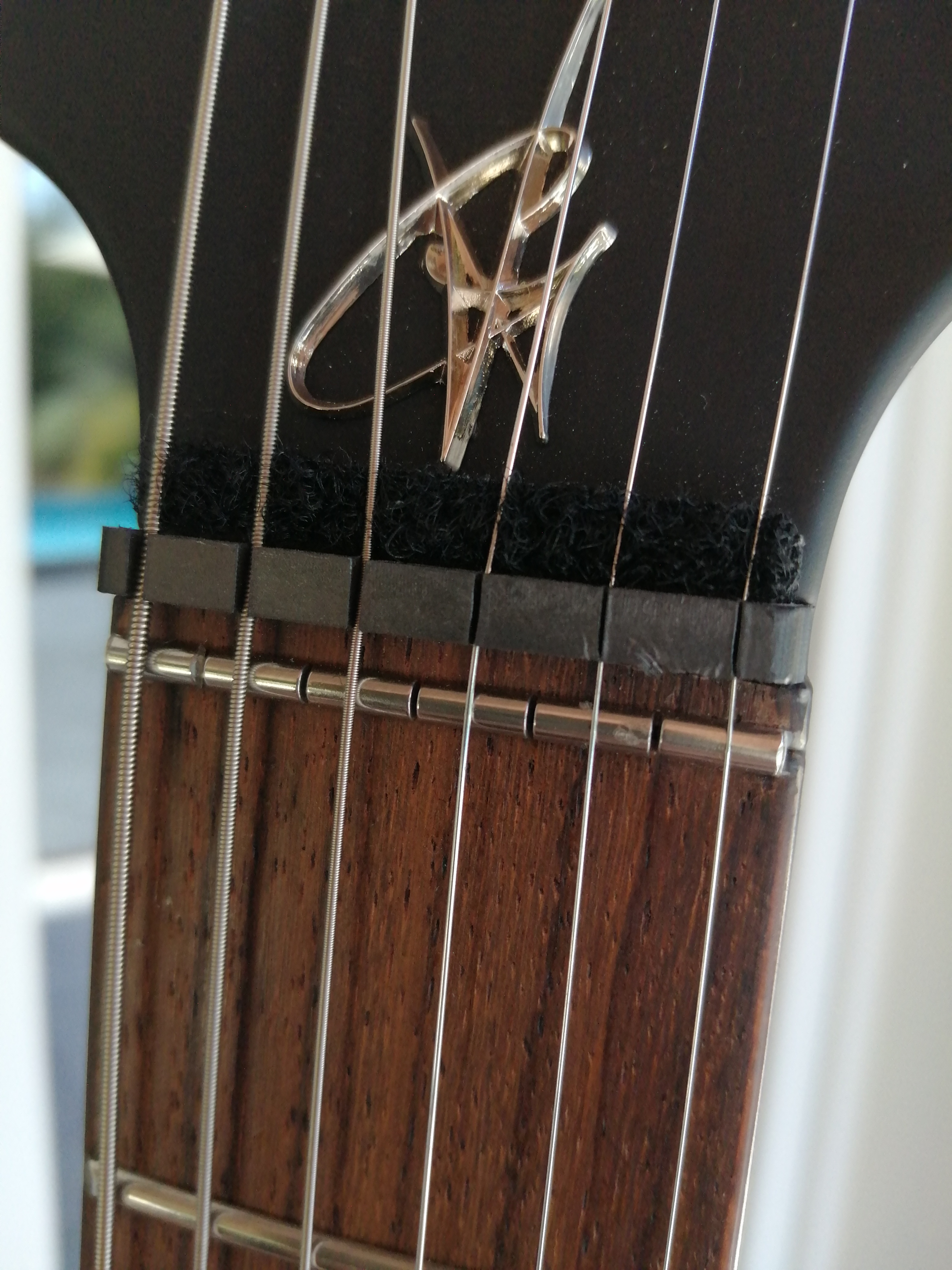 J'ai donc élevé un peu le chevalet après avoir desséré la vis de blocage... ça continue de friser... j'ai donc encore élevé la hauteur du chevalet... je suis quasi au max de la hauteur si je ne veux pas qu'elle frise, et du coup j'ai une légère frise sur la corde de sol au quand je la joue au milieu du manche... en regardant de plus près je vois (cf photo) que la frette 0 du mi aigu est placée un peu de travers par rapport aux autres frettes 0 Les 5 frettes (mi la re sol si) sont alignées mais le mi aigu n'est pas horizontal et et semble s'enfoncer un peu plus que les autres sur le bord extreme droit du manche (cf photo)
