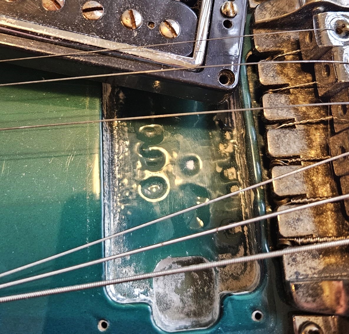 C'est parce-que la guitare a été repeinte et celui qui l'a fait n'a pas pris le temps de masquer les informations.