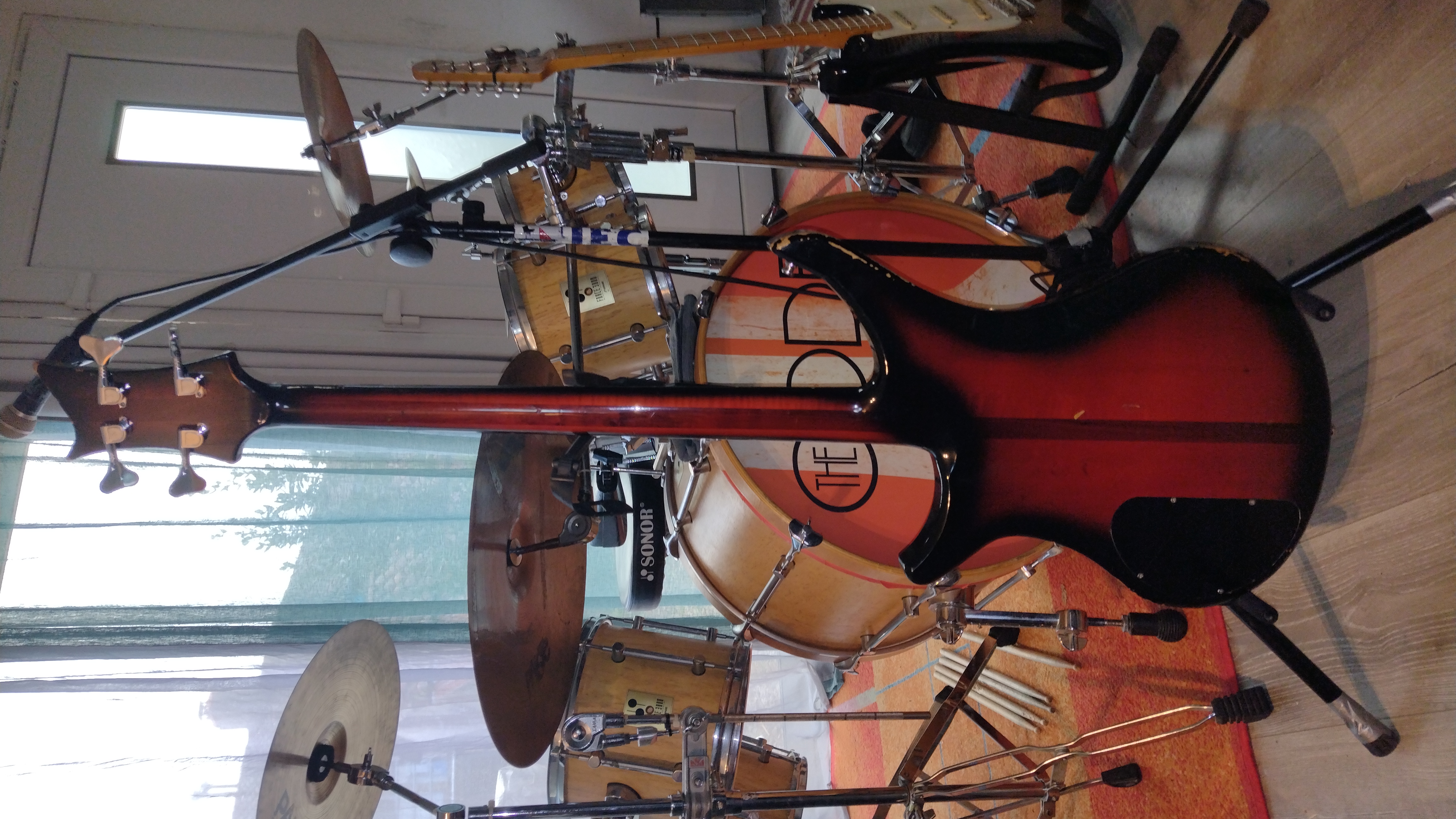 Bon par contre, en 30 ans, je ne l'ai pas épargnée et elle a été jouée quasi tous les jours et dans des conditions parfois compliquées.. avec le temps elle a perdu quelques pièces et pas mal de vernis. Je lui ai déjà fait une remise en forme (refrettage, mécaniques, rebobinage micros) et j'envisage un vernis..